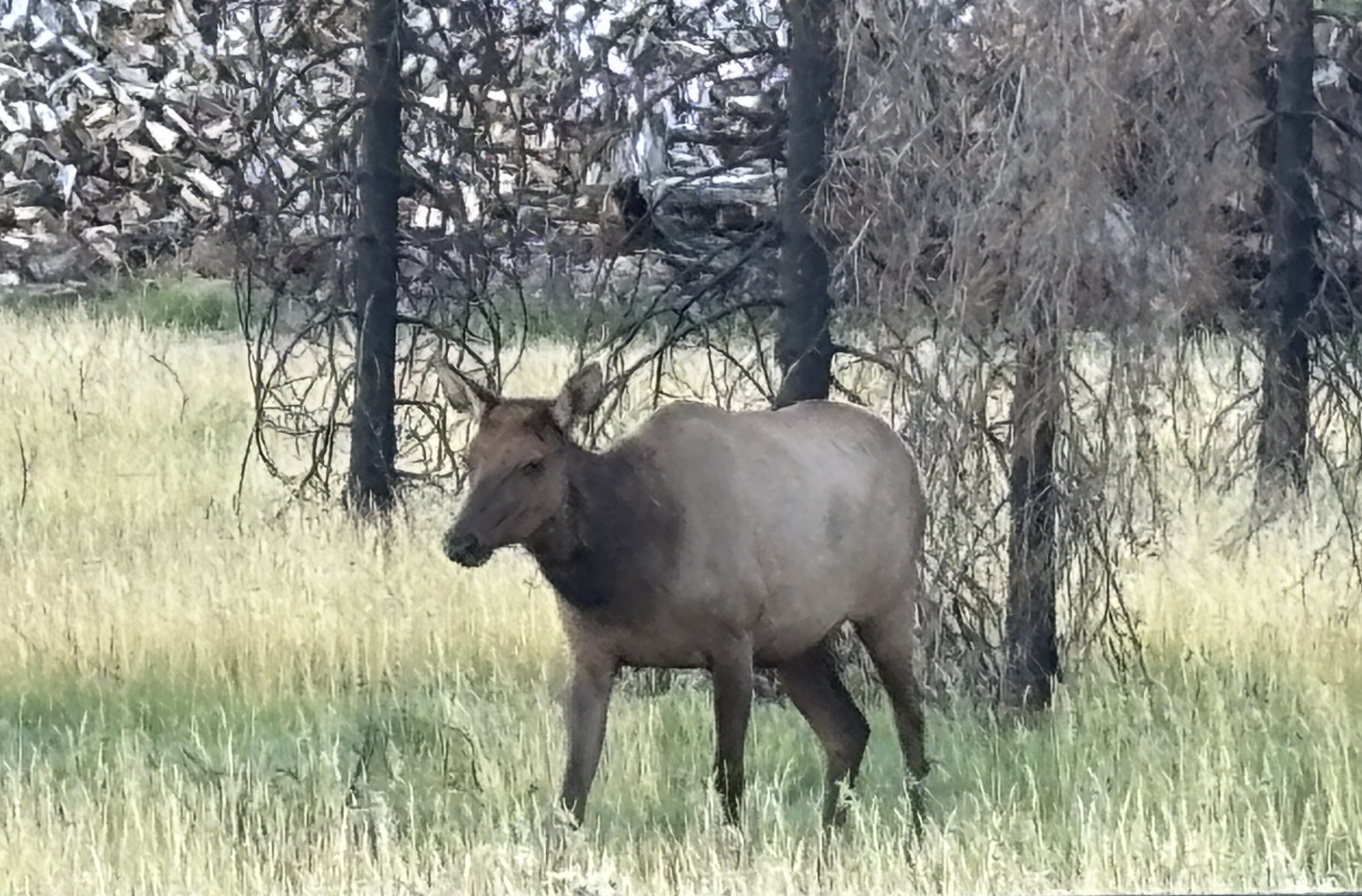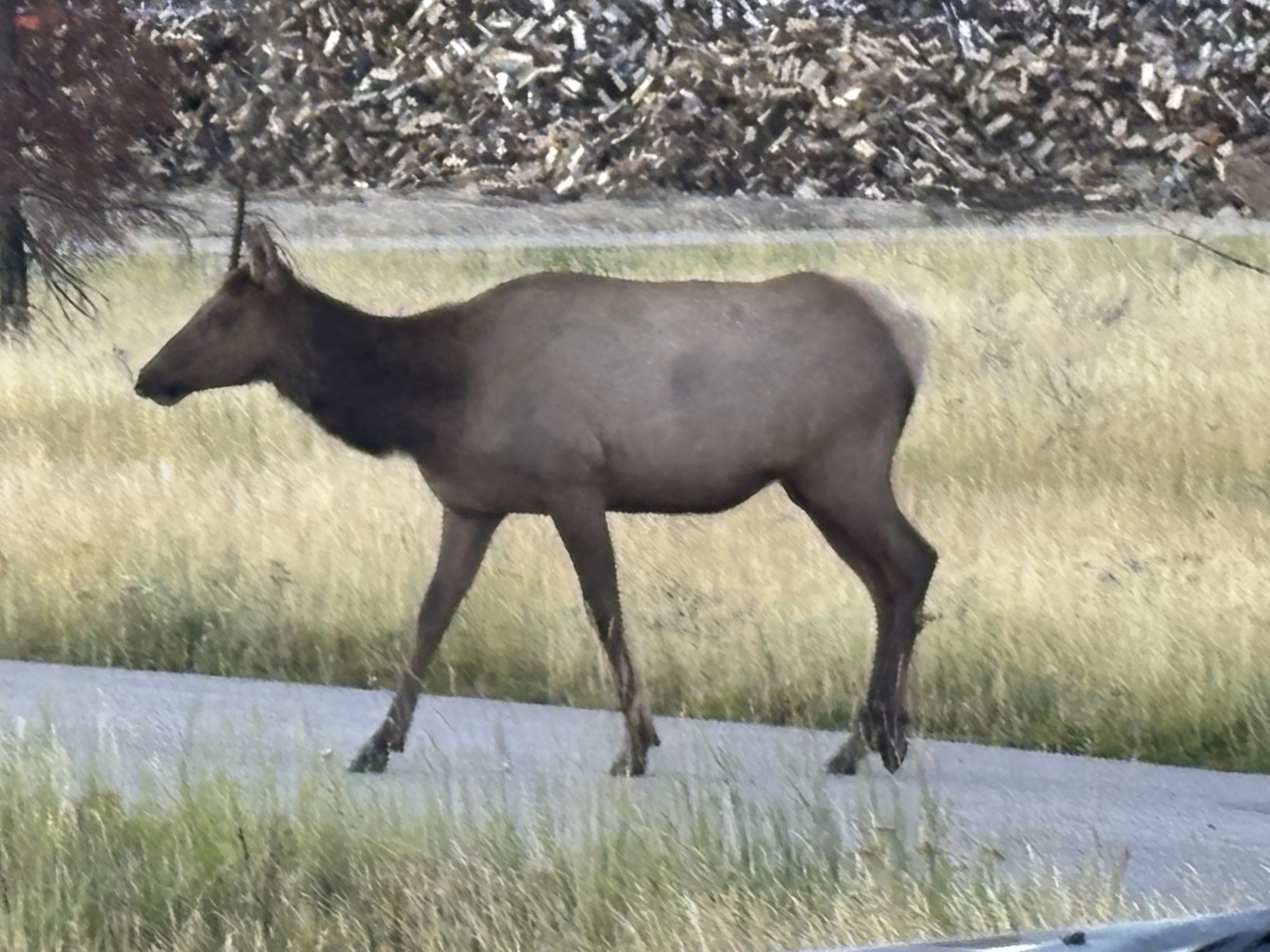 We woke up early with plans to head back down the Icefields Parkway. We were packed up and ready to unhook. But when we opened the door, we were greeted with a small group of elk just outside our RV. There were about 6 grazing in the center part of our circle. They really didn’t seem to care that everyone was coming out to take photos. I also spotted a coyote over near the wood pile, but he was heading into the trees pretty fast!