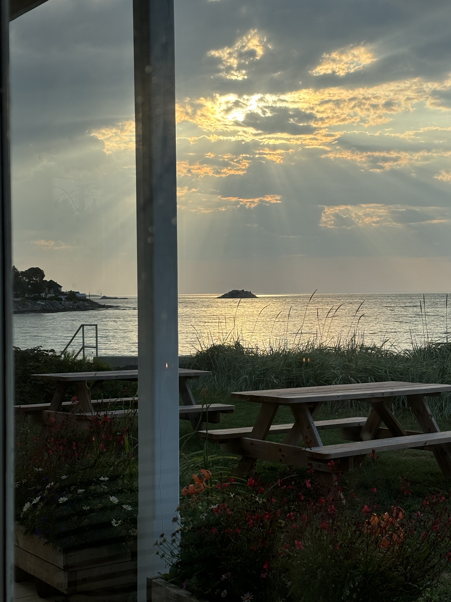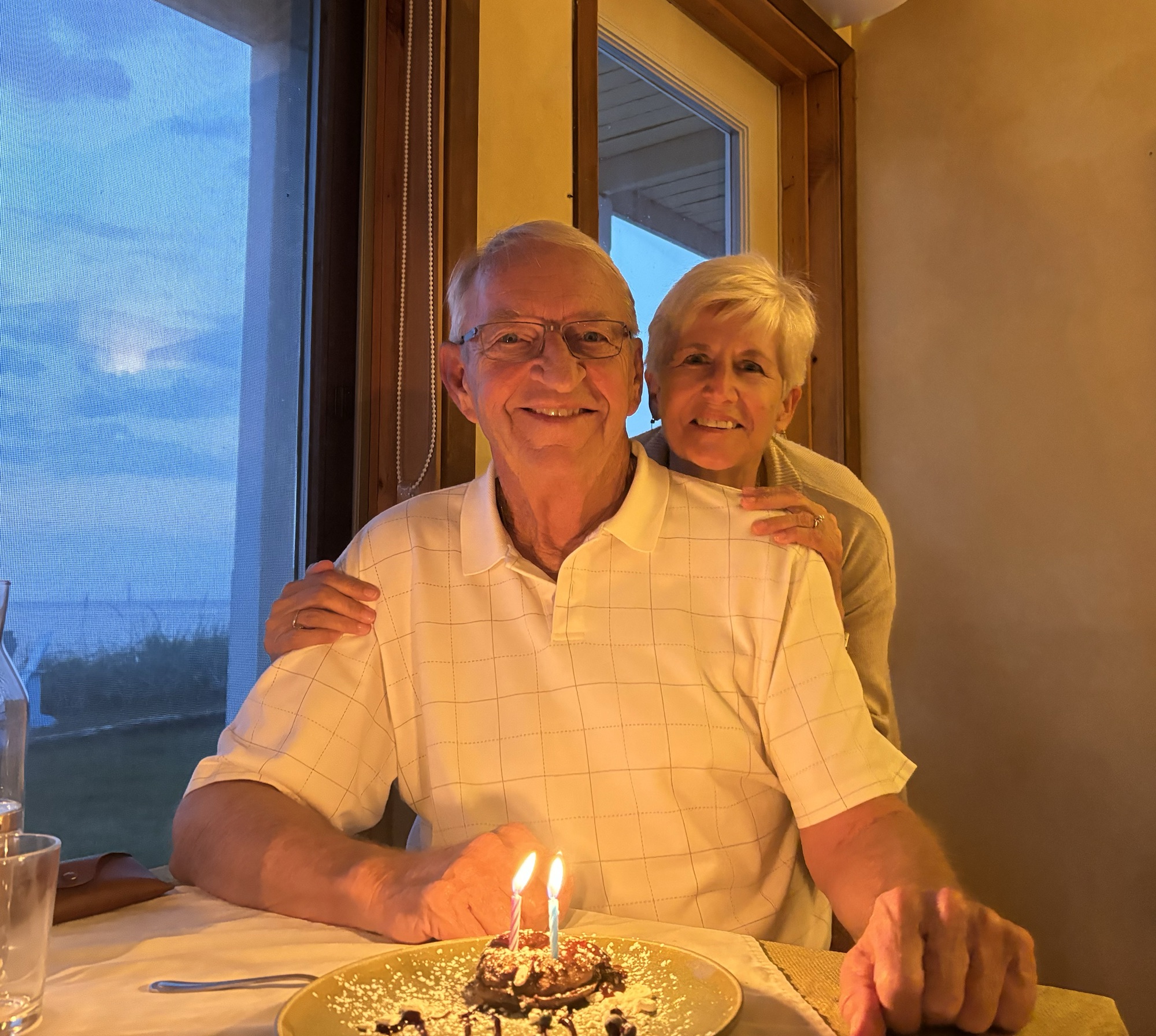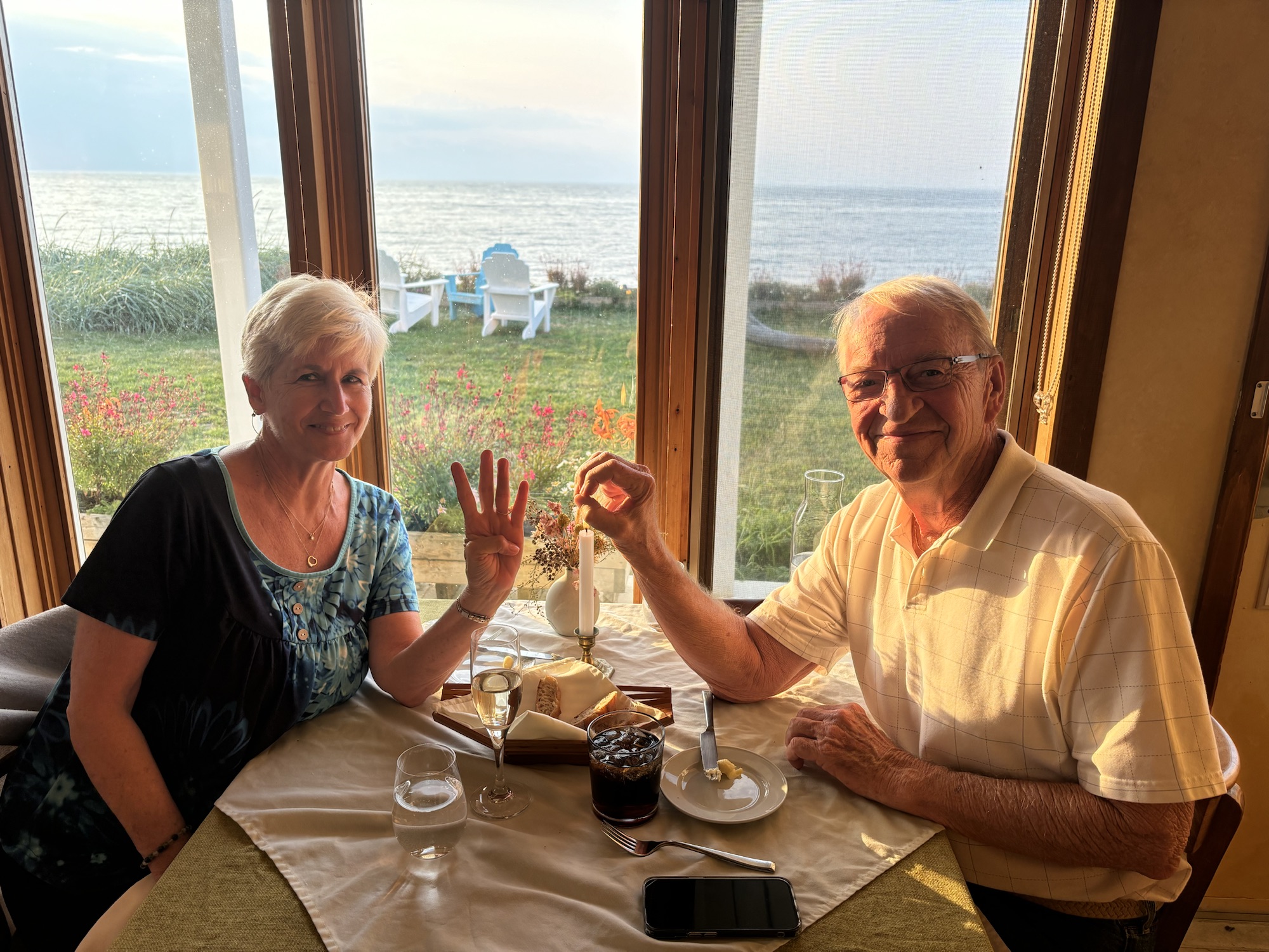 It was 5:45 and they did not open officially until 6. But the waiter (Fares, kinda’ like in Bueller) said he could work us in and to go pick a table. And since we were the first in the room, we picked the one right next to the window looking out on the water! He brought Gail a Prosecco and made me some kind of rum and coke cocktail that was really pretty good. We struck up a conversation about the restaurant and his 10 summers in the area. The menu was a fixed price 4 course meal, but he let us order one and add an extra appetizer which was perfect for us. And he brought the dessert special with candles for the occasion. Both Gail and Fares took photos of the sunset over the water which turned out great! The evening turned out to be a very nice and special celebration. One we will remember.