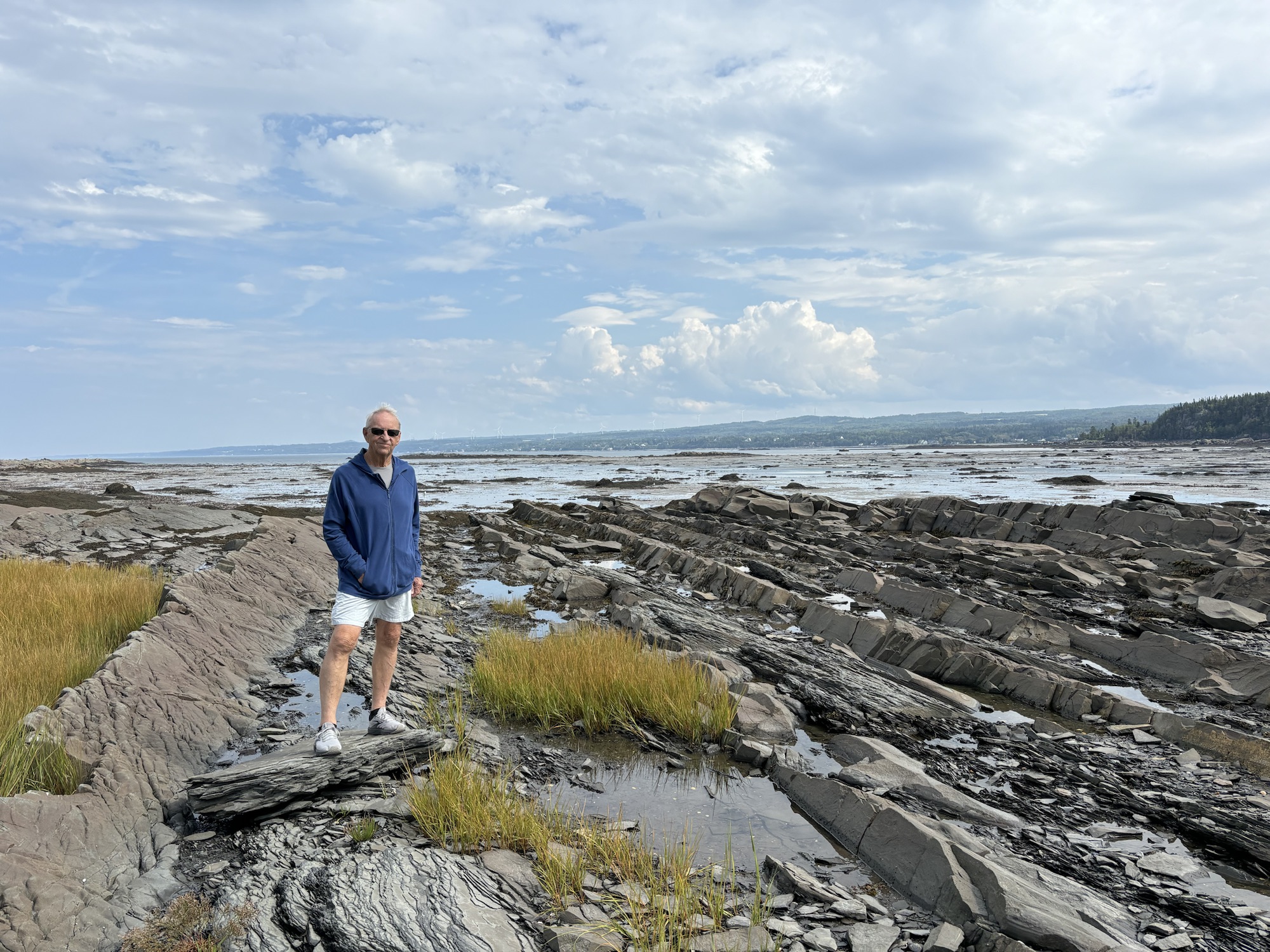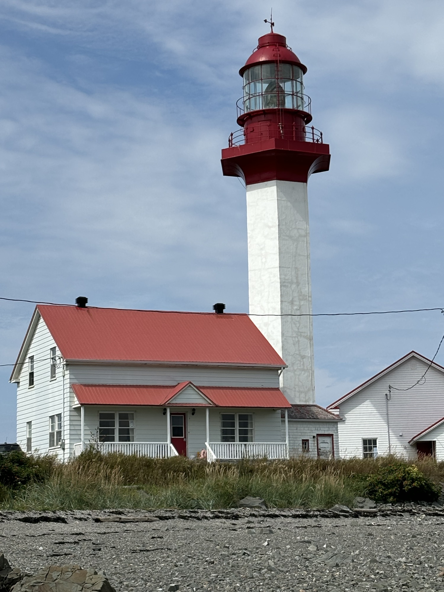 The next morning, we stayed in for a late breakfast and went out for another drive around noon. This time we stayed close to the park and hiked out to the Point Metis lighthouse. We could see it working from the restaurant last night with its unique 3 flashes every 10 seconds. We met a man from Calgary that comes to his house here every summer and back to Alberta every winter! He said we could walk on his beach to the lighthouse which turned out to be very challenging but also interesting since the tide out was out.