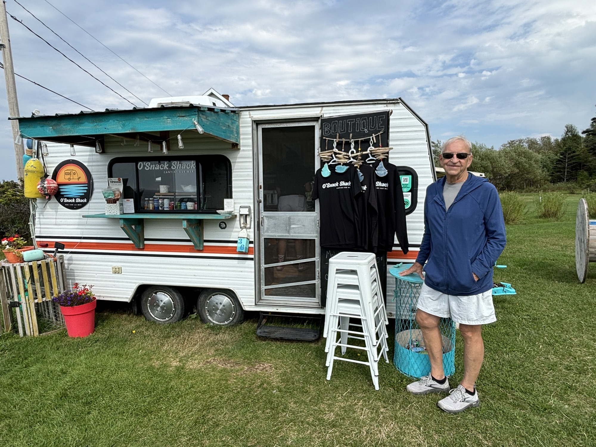 We then drove again on another section of the shoreline drive and found O’Snack Shack in Baie de Sables. It was a small trailer with a big menu! And a great shrimp roll for lunch. Then back to the RV for the evening and to work on the blog some more.