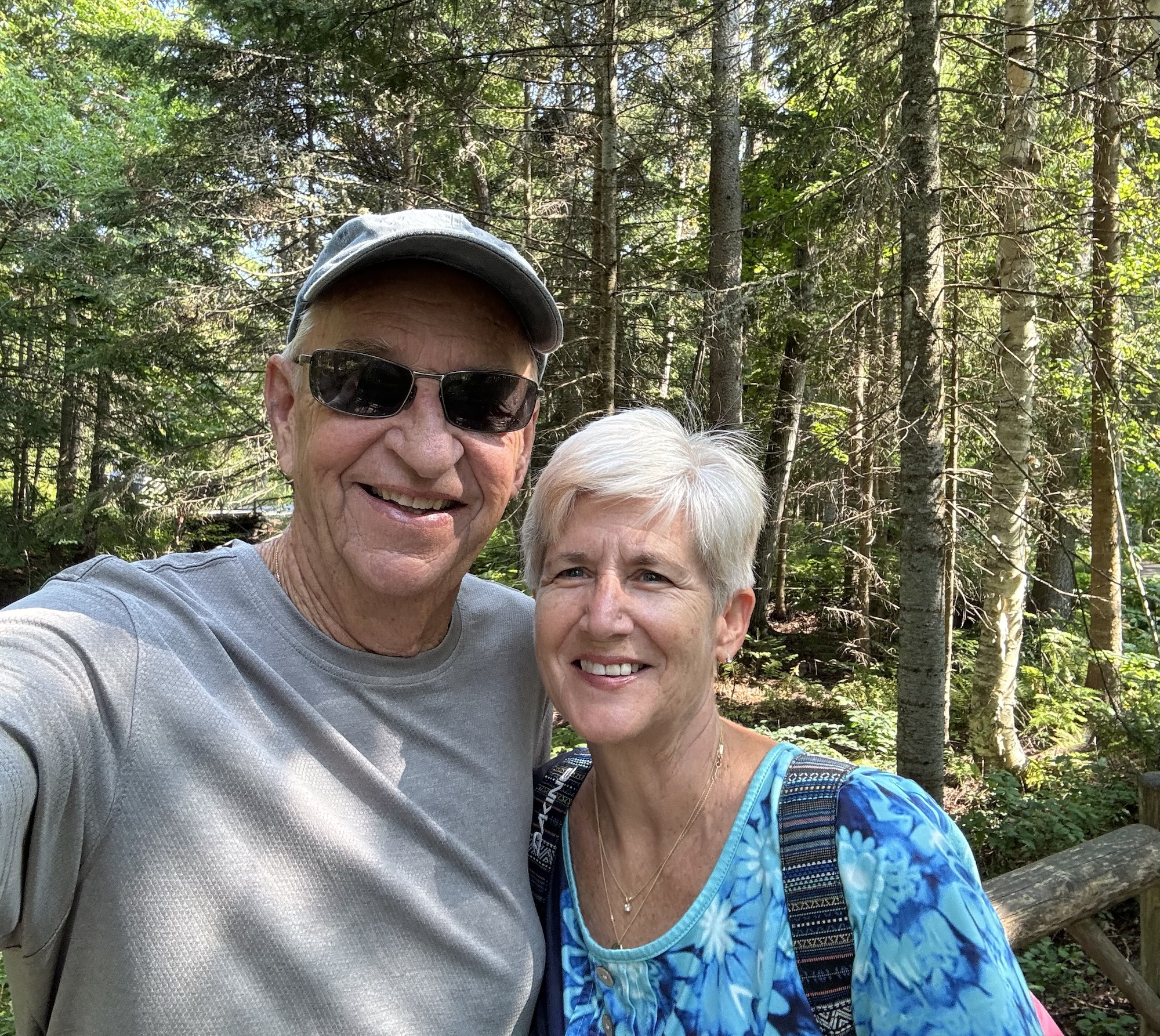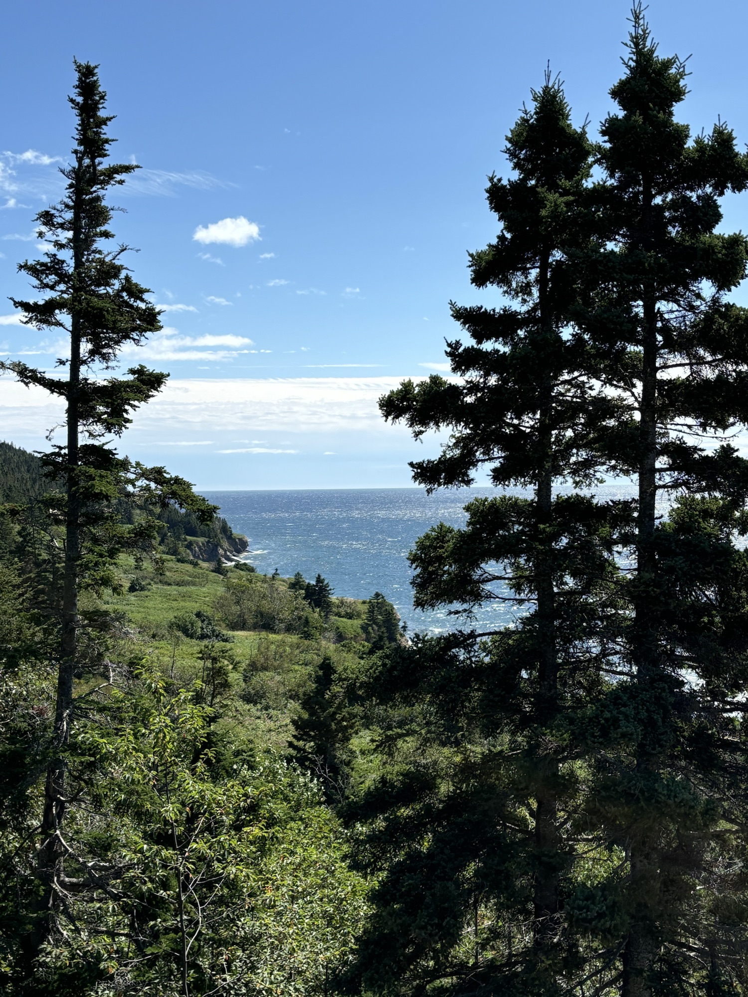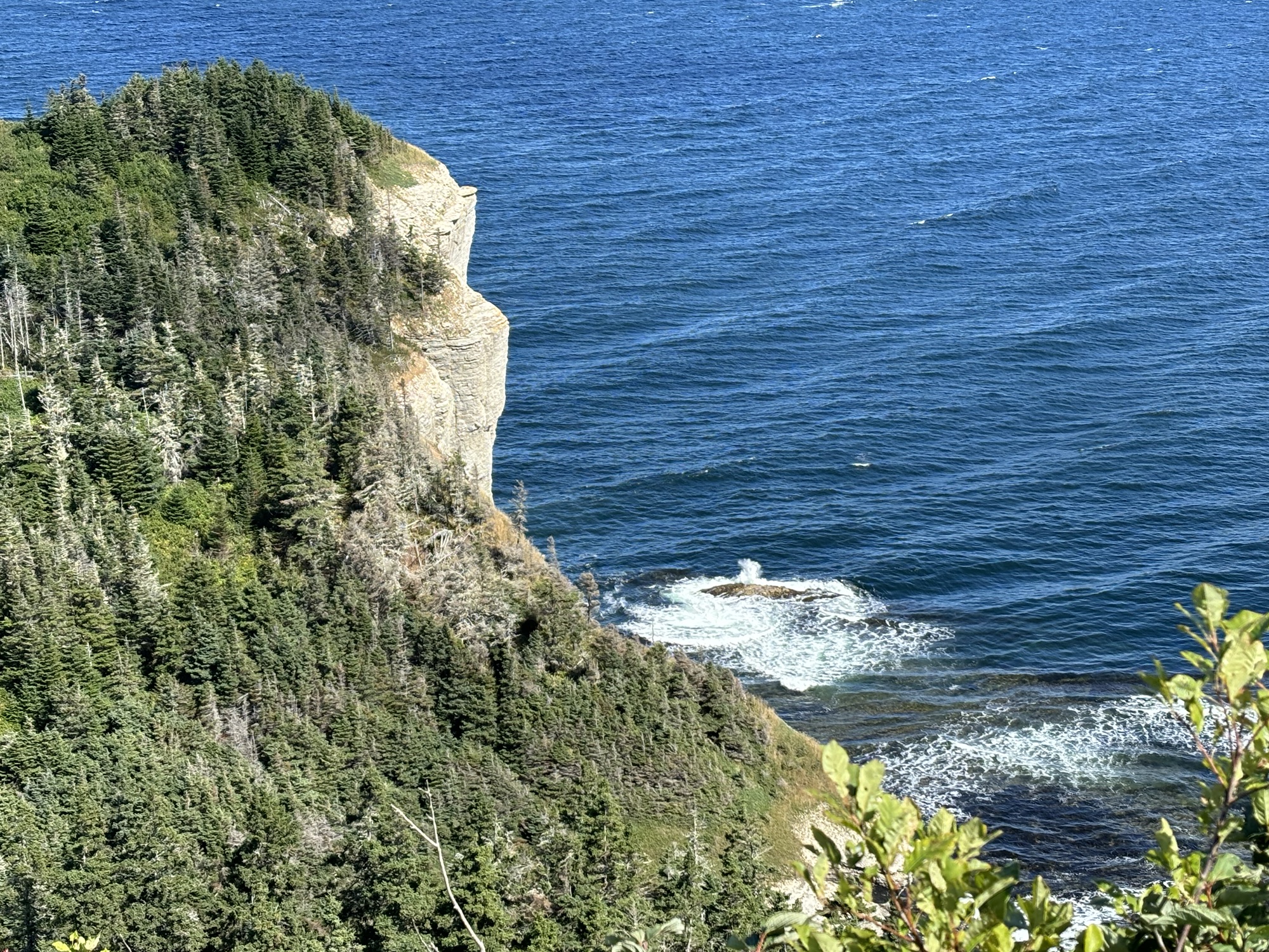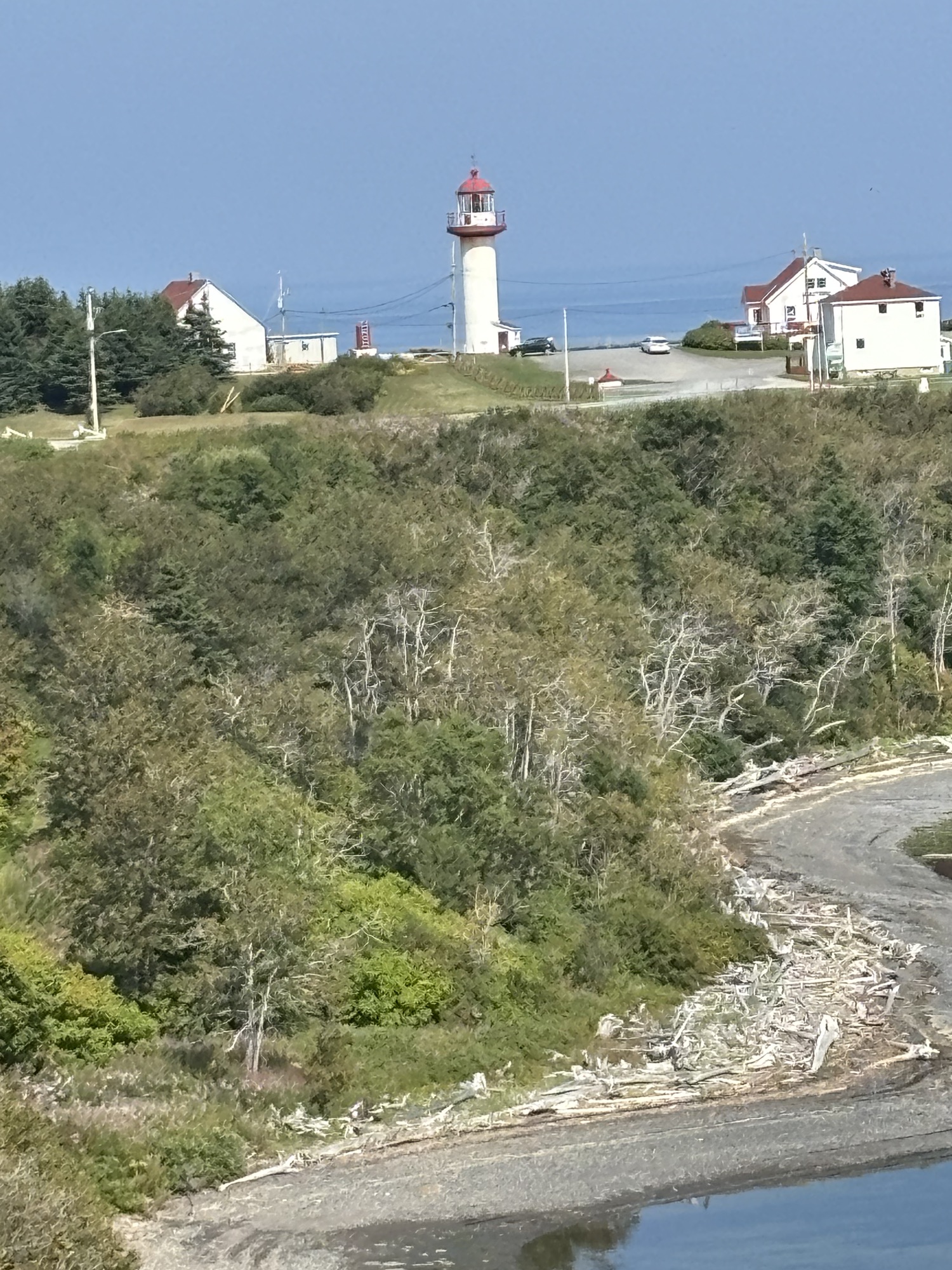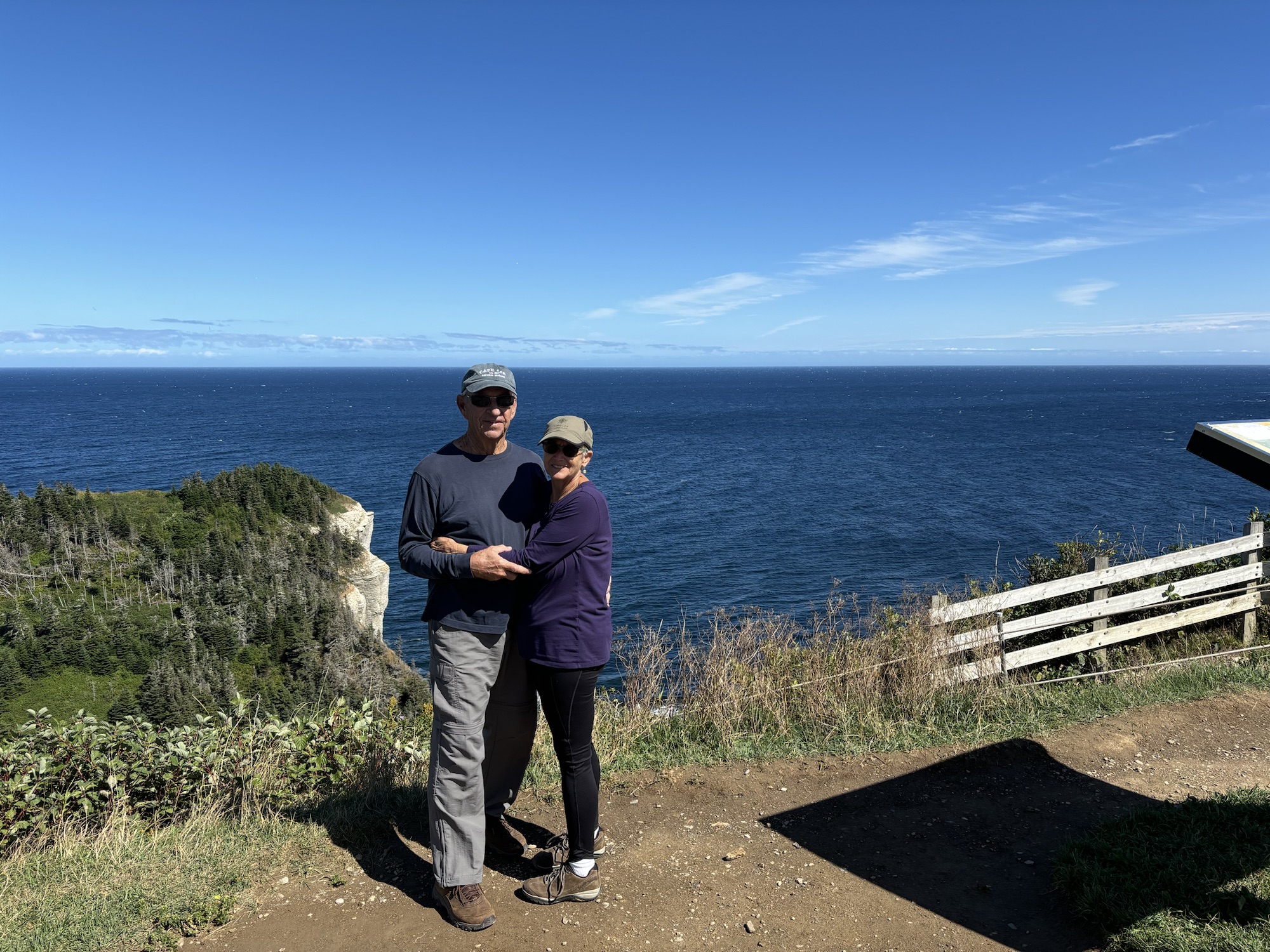 Then we drove to the south side to do the hike up to the Cape Gaspe lighthouse. After parking, we took the “easy” gravel road vs the hike through the woods, and soon found that the “easy” might have been exaggerated a bit. Although not terrible, the steep inclines rising up in various stages to 280 ft made it challenging. Gail used her new hiking poles (Thanks Chris Buck!) which helped her especially on the aforementioned inclines. We made it to the top and the view was amazing. Again, the cliffs and beaches below were fantastic. And we saw a fairly large pod of seals below playing in the waves.
