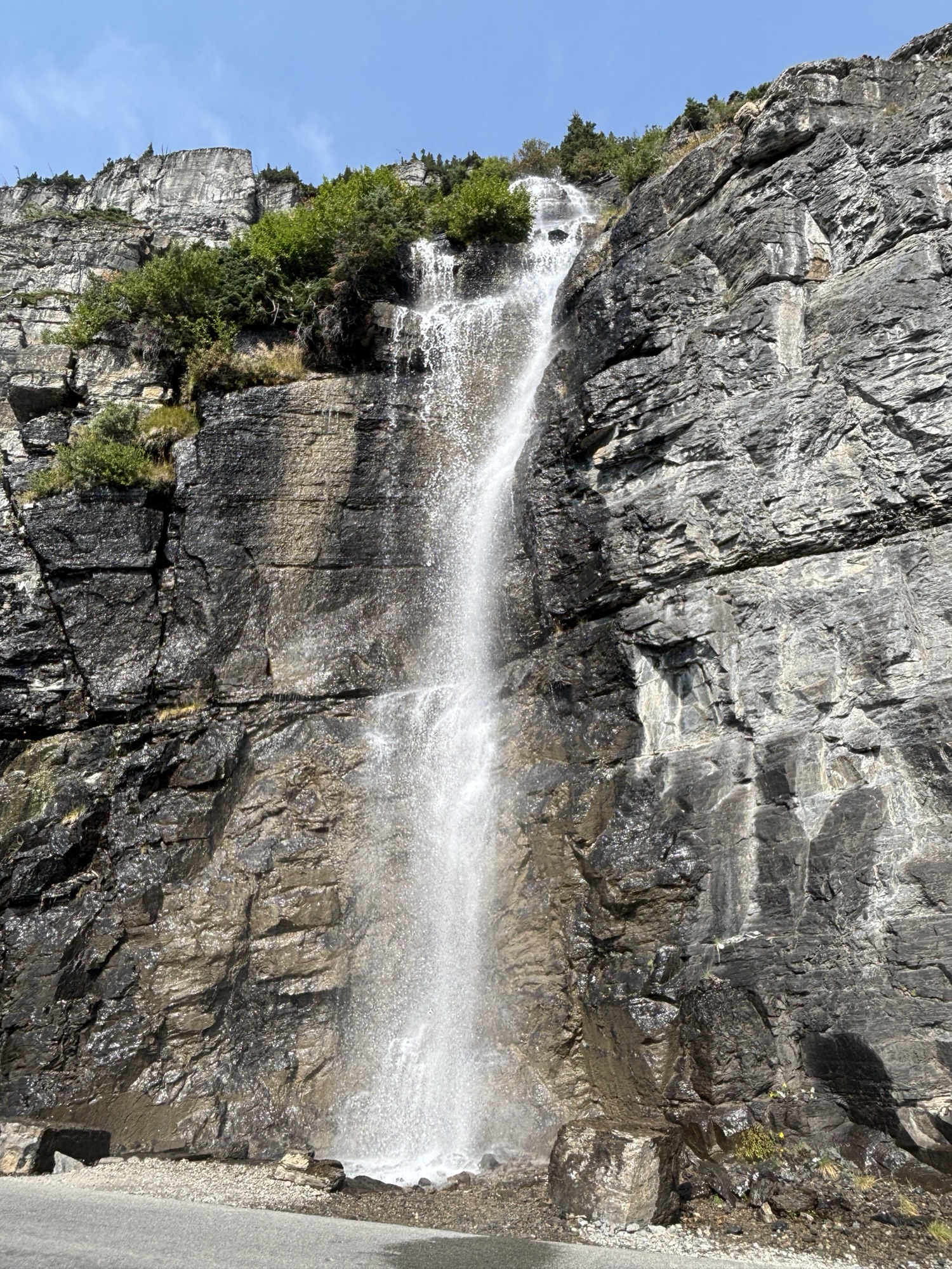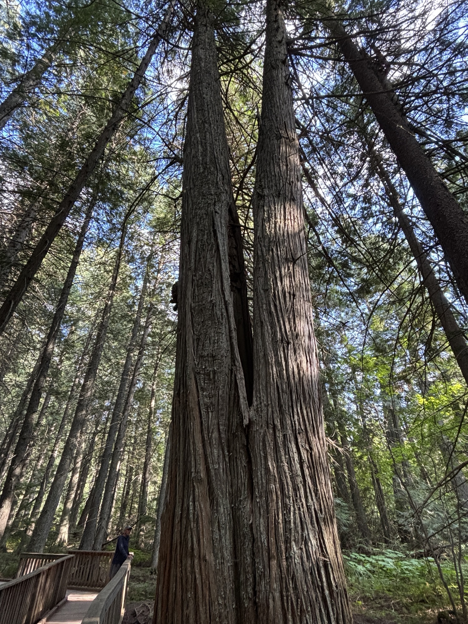 After a quick ice cream at the Lodge and a walk to the lake, we headed back east on the same road. This time we did get some parking spots at a few of the turnouts. We did the Trail of the Cedars board walk to see the giant red cedars. And we stopped at a couple of the waterfalls near the road. We also got a bit wet with the tops off as a quick rain shower came by!
