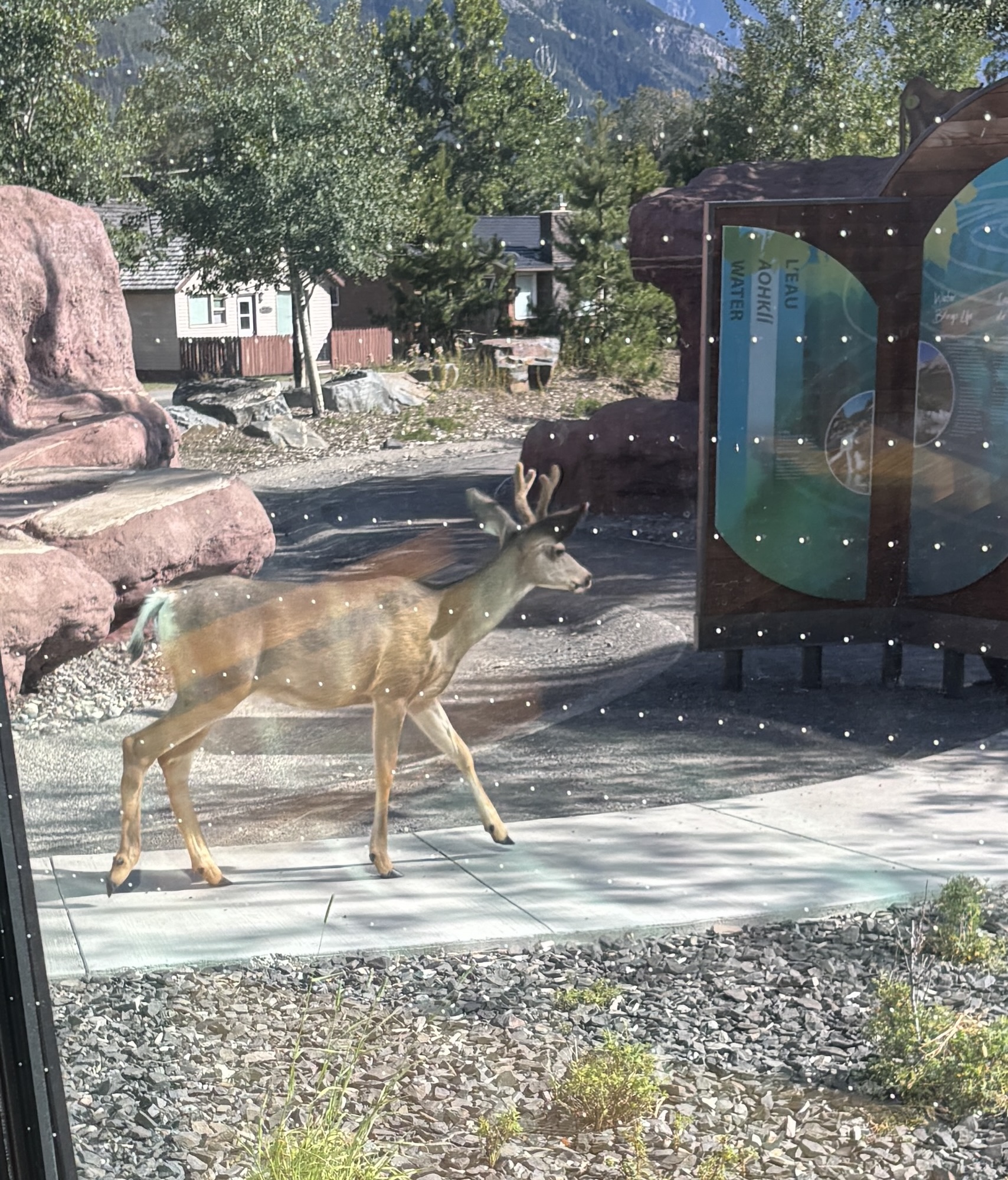 Next, we headed into the town of Waterton Lakes and did a walkaround, viewed the waterfall in town and then headed back to the RV. We did see a a group of goats in parking lot on the way to town and few deer outside the information center.