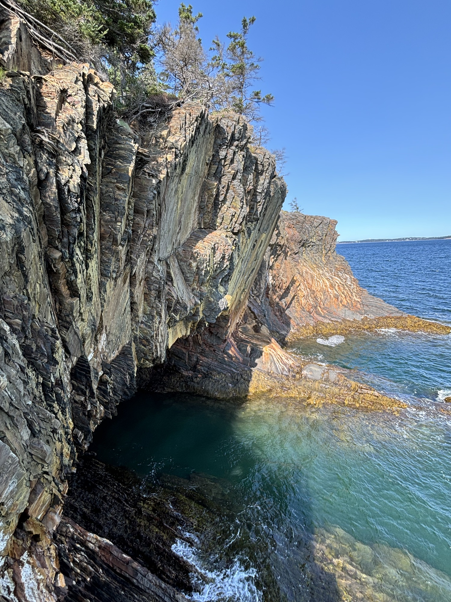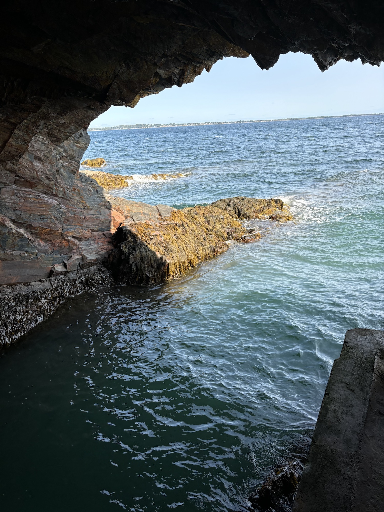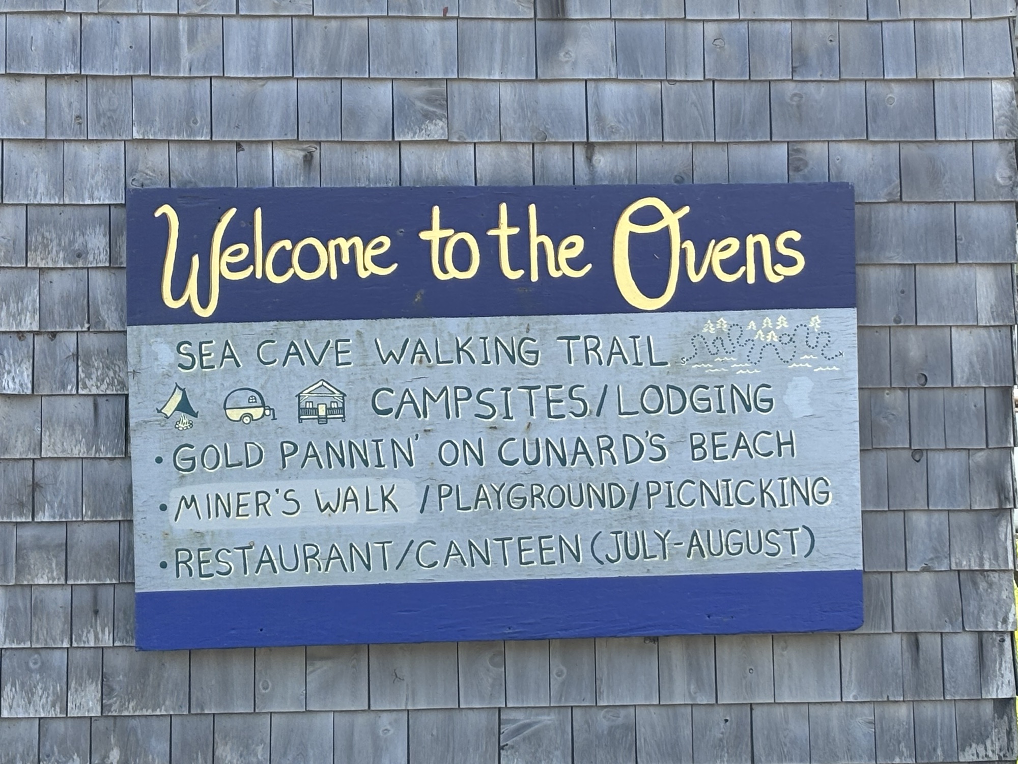 And just before we left the next morning, we took a few minutes out to go to The Ovens. It is a series of caves in cliffs at the water line that are physically located currently as part of an RV/camping park. They are famous as the area where gold was discovered in 1861 and set off a small gold rush of their own. The actual gold rush only lasted a few years as there was little gold recovered and one man (a member of the Cunard family) began dredging the beach off shore and shipping the sand to Wales for processing. An interesting story, but the geology and topography is even more interesting and we are glad that we made the stop.
