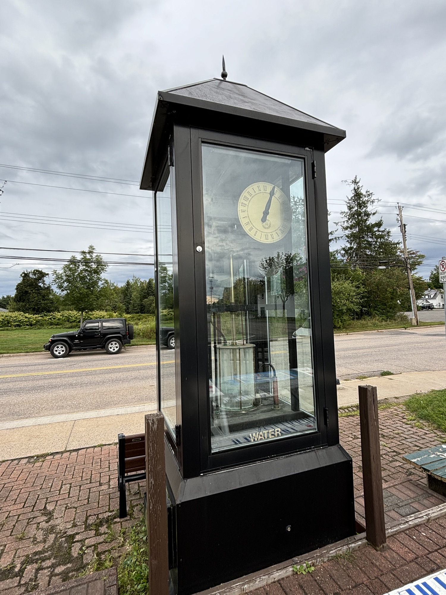 Then, while searching nearby for interesting stops, we found a reference to a water clock located in the next town of Middleton. Historically, the water clock concept went back to about 1400 BC by the Babylonians to replace the sundial. And it was used in many countries of Asia and Europe until the mechanical clocks were developed in the 14th century. And there are only 3 known water clocks on display in North America now, and one is in downtown Middleton. So, we went to check it out. We found the clock, but it had not been well maintained and was not working. However, we could see the basic principle of operation and it was still interesting to see.