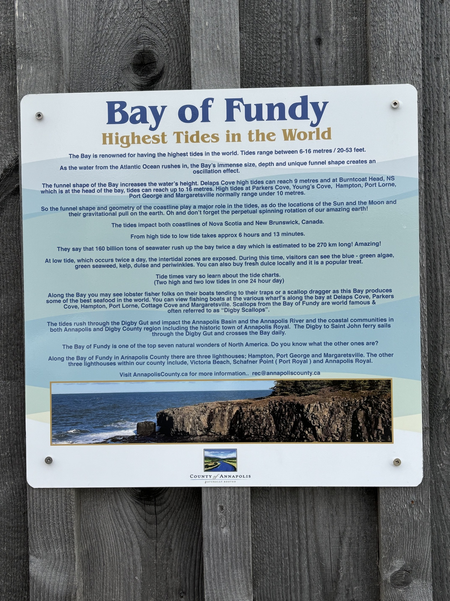 Then we wanted to see the actual Bay of Fundy and headed to the coast at a town named Margaretsville. No, not a Jimmy Buffet resort. Not even close. Just a similar name. Anyway, it was good to finally see the Bay as it spreads out between New Brunswick and Nova Scotia, and to check out the little fishing village on the Bay.