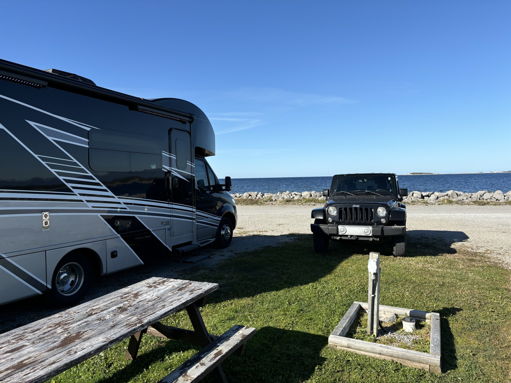 We hopped back on Trans Canada Hwy 1 to Deer Lake then turned onto Hwy 430 and headed north. Our destination was Cow Head at the Sea Breeze B&B and RV park. We got a text to meet our friends at The Whale’s Back Grub Hub in Sally’s Cove which, when we checked, we had just passed. We pulled into a large parking lot, unhooked the Jeep, locked up the RV and went back to meet them! We had a good lunch and got caught up with our friends. Then we went back for the RV and finally made it to the park, got settled, and then went to find the laundry mat in Cow Head.
