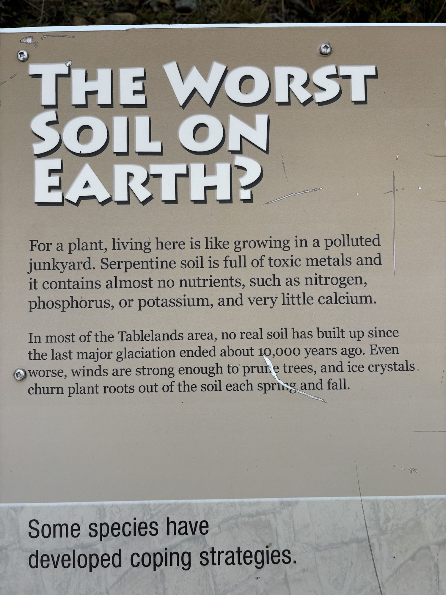 But the park has many other features, and we met up with our friends at the Visitor Center to learn more about the formation of the park and what there is to do now. They decided to go on to Trout River and have lunch and we selected a hike to the Tablelands mountains.