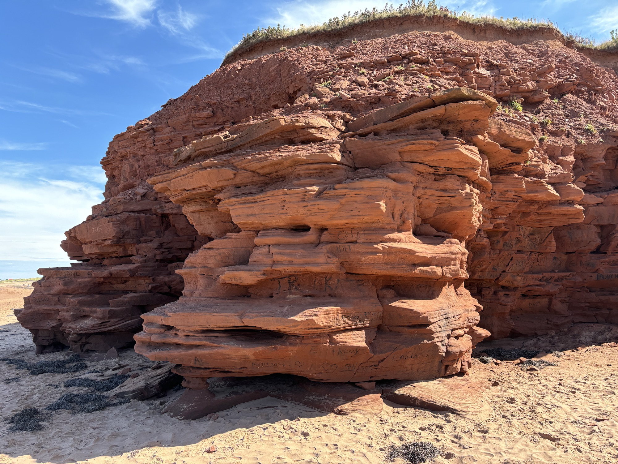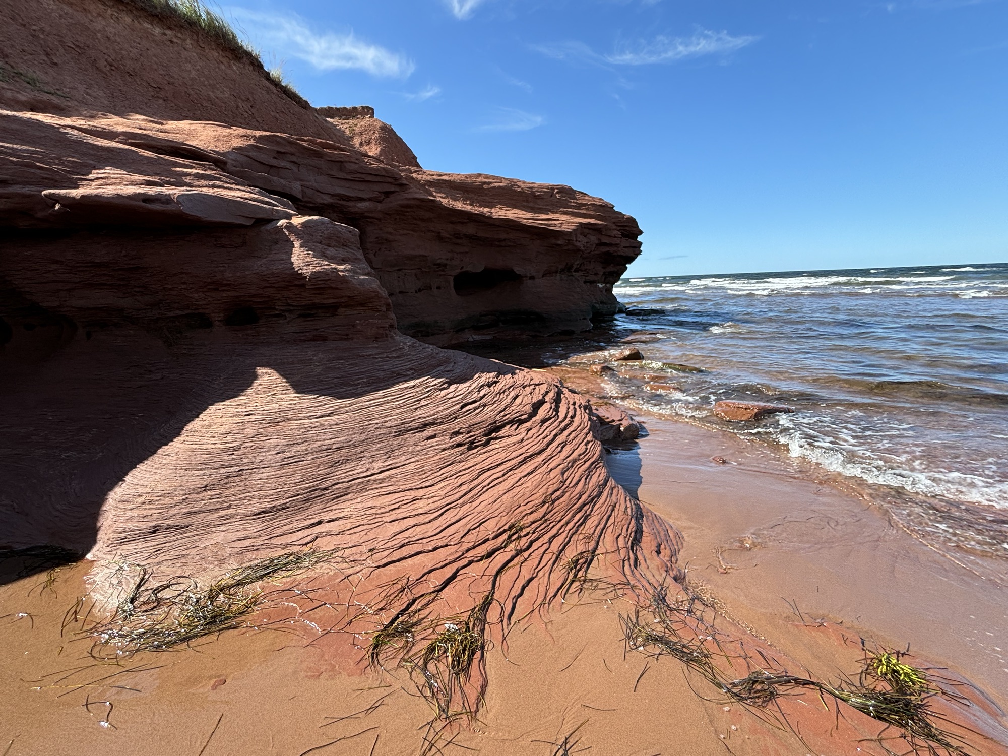 There was a famous beach called Thunder Cove which is known for its red cliff rock formations and red sands. On the way, we stopped at (you guessed it!) the North Rustico lighthouse. We drove by the many Anne of Green Gables historic sites that tell the story of Lucy Maud Montgomery and her life on the island and enjoyed the views of the villages and farms along the way. The cliffs were amazing the way they had been sculpted by the waves and wind. And so red, I think that I could almost see the color! Very nice. And the water was cold.