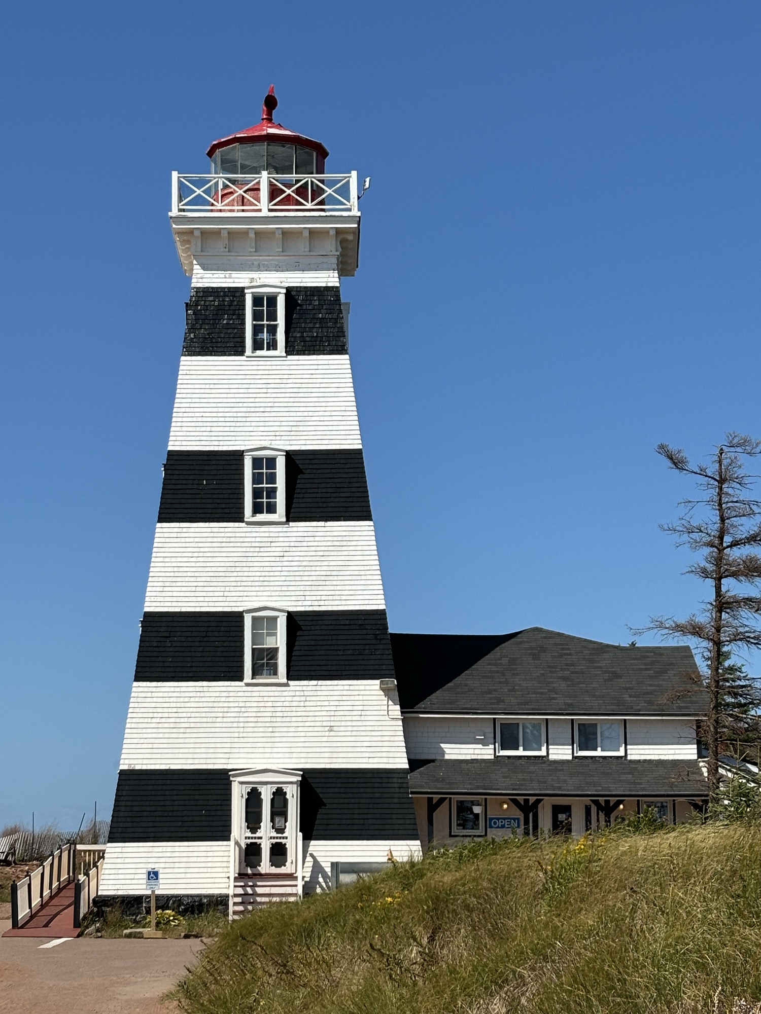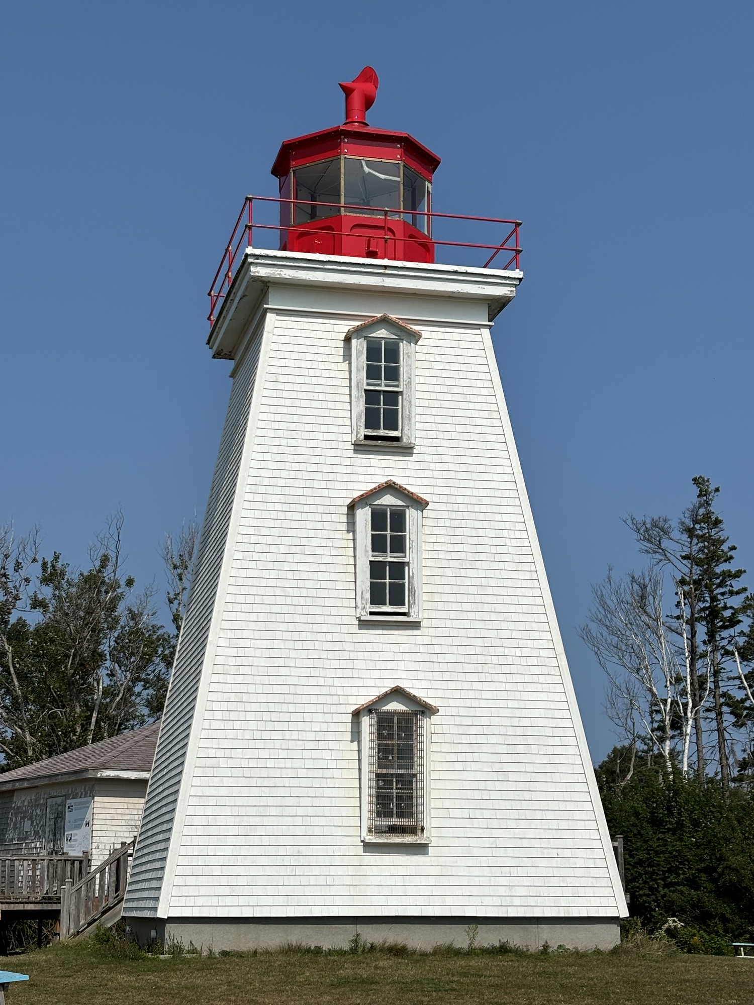 Further up the coast we stopped to see a couple of lighthouses, especially the famous one in West Point near the Cedar Dunes Provincial Park. It is unique due to the black stripes at several levels and the square windows in the stripes. There are 12 major lighthouses with over 60 total lighthouse or range lights on the island. Here are some of the ones we saw.